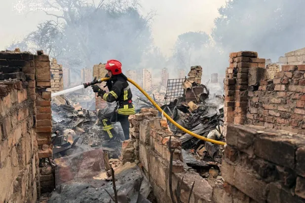 رجال إطفاء يُخمدون حريقاً بعد هجوم روسي في منطقة جيتومير (أ.ف.ب)