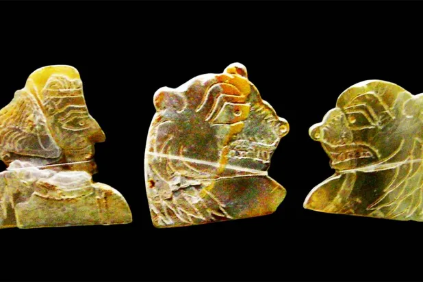 إلى جانب هذه المجموعة المميزة، تحضر ثلاث قطع منمنمة مزيّنة بنقوش تصويرية، صُنعت ممّا يُعرف في قاموس علم الآثار بـ«أمّ اللؤلؤ»، أي من الطبقة الداخلية اللامعة الخاصة بصدفة الرخويات التي يتكوّن منها اللؤلؤ، وتُعرف هذه المادة الصدفية كذلك بعرق اللؤلؤ، وهو المصطلح الأكثر شيوعاً. عُثر على هذه القطع المنمنمة في ركن ضمّ قبرين من قبور مقبرة «البلية»، وهما القبران اللذان حملا الرقم 5 والرقم 6 في التقرير الخاص باستكشاف هذا الموقع، وهي على شكل ثلاثة رؤوس في وضعية جانبية، صُوّرت ملامحها بأسلوب فنيّ واحد.